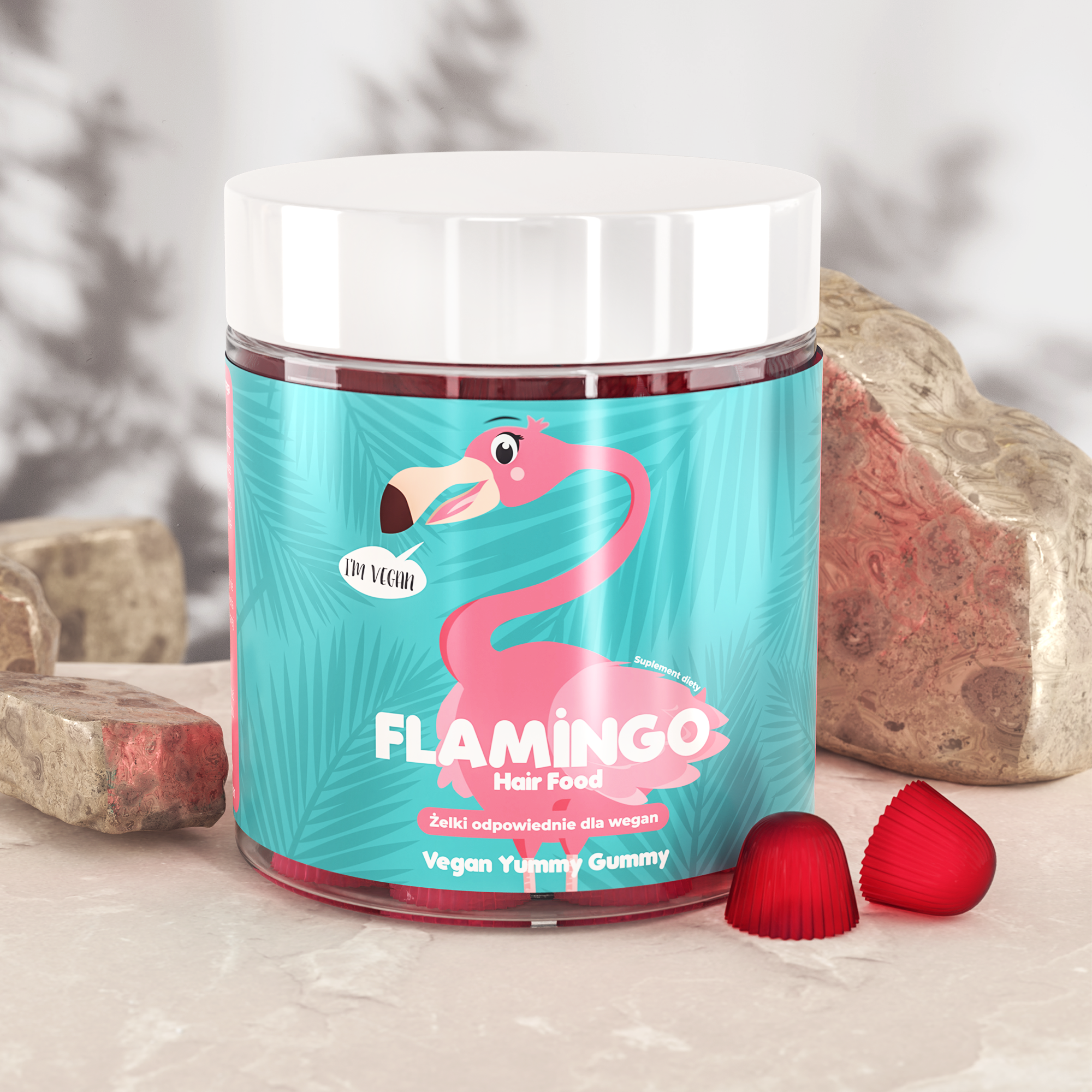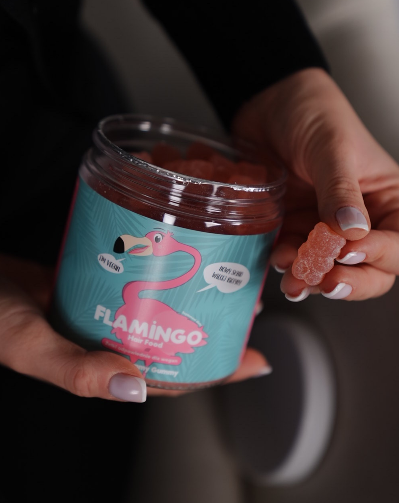 Abbiamo creato le caramelle gommose Flamingo per offrirti una dolce coccola che, grazie alla biotina, sosterrà anche i tuoi capelli. Ogni caramella gommosa contiene 11 ingredienti attivi: vitamine e minerali importanti, e ogni porzione copre il 100% del tuo fabbisogno giornaliero. In questo prodotto non troverai ingredienti di origine animale. Il fenicottero è solo nel nome, quindi vegani e vegetariani possono gustare Flamingo Hair Food in tutta sicurezza.